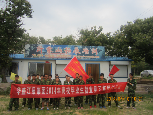 2014年7月6日-10日,華盛江泉集團2014屆大學生訓練營成功舉行。本次報到大學生共21人,為磨煉大學生意志、激發大學生工作熱情、培養其團隊合作精神、促進大學生的快速成長,集團人力資源部制定了以軍訓、入職培訓、拓展訓練為主要內容的培養計劃。